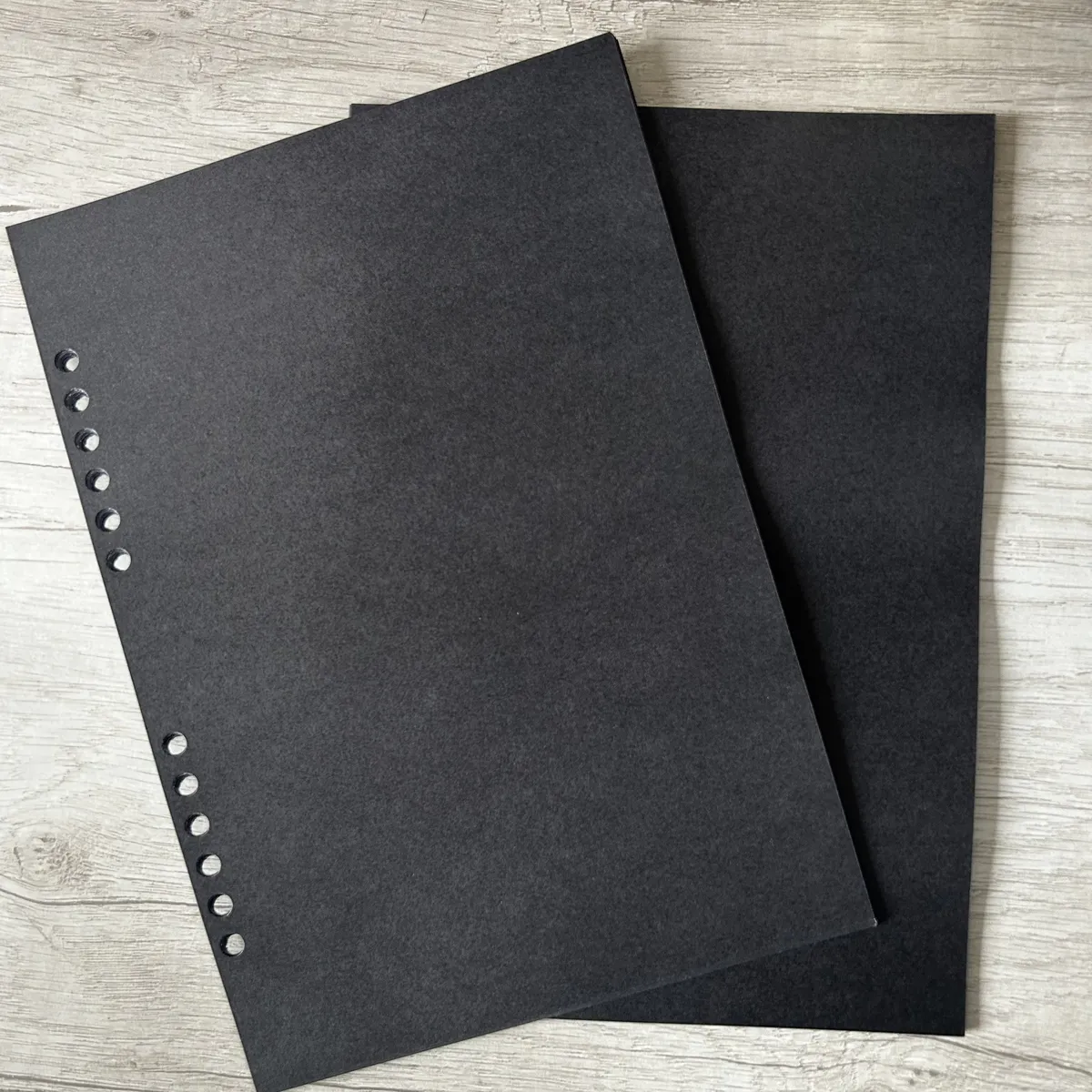 Hojas de papel negro profundo de alto gramaje, diseñadas para resaltar trazos en tinta blanca, metalizada o neón. El complemento indispensable para tu Journal Manifiesta.